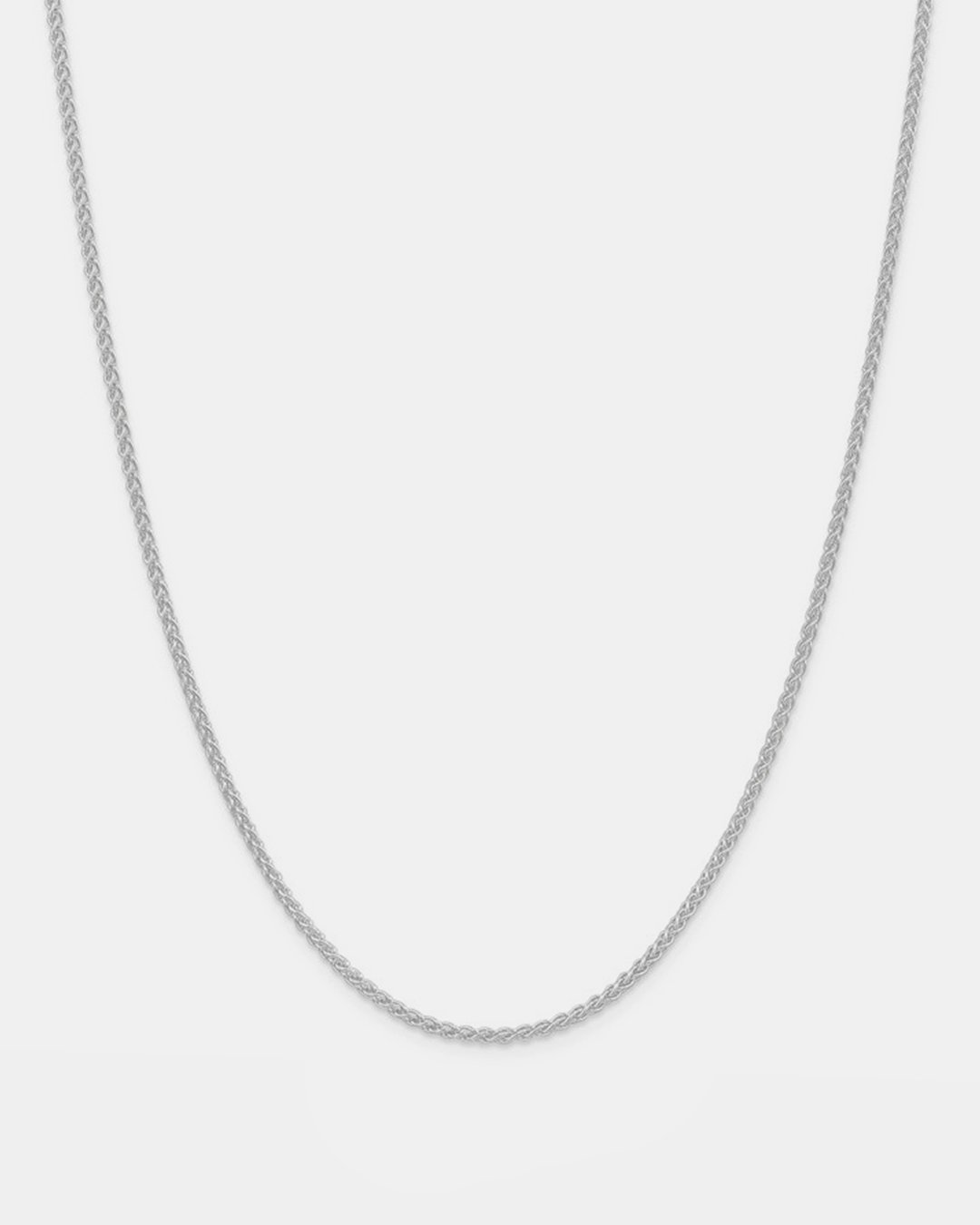Cadena Espiga en Plata Italiana 925 pulida, cuenta con un recubrimiento en Rodio para un acabado brillante y una mayor protección de la pieza