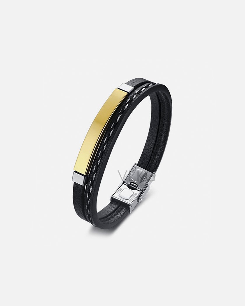 Pulsera Cuero Genuino con Barra en Acero Quirúrgico Bañado en Oro 18kt